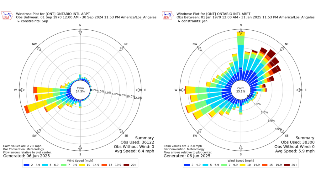 Wind roses (above) are used to summarize how wind behaves at a specific location over time. Each spoke points to where the wind comes from, with length showing frequency and color showing wind speed. In this comparison, the September wind rose (left) shows mostly westerly winds, while the January wind rose (right) includes strong northeast winds typical of Santa Ana events, highlighting an extreme example of seasonal differences in wind behavior.